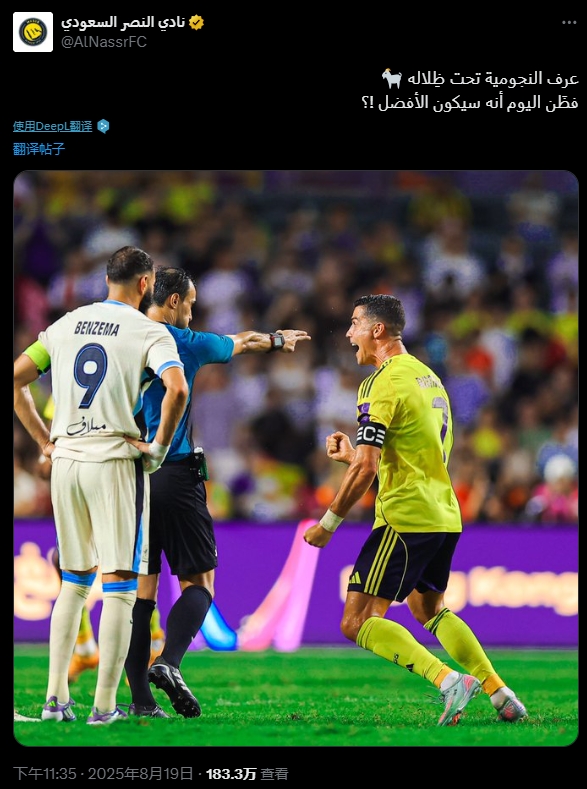赛后利雅得胜利官方发布C罗与本泽马同框画面,配文称:他曾立于巨人的影中,领悟传奇的真谛。而今,他是否自诩登顶巅峰?